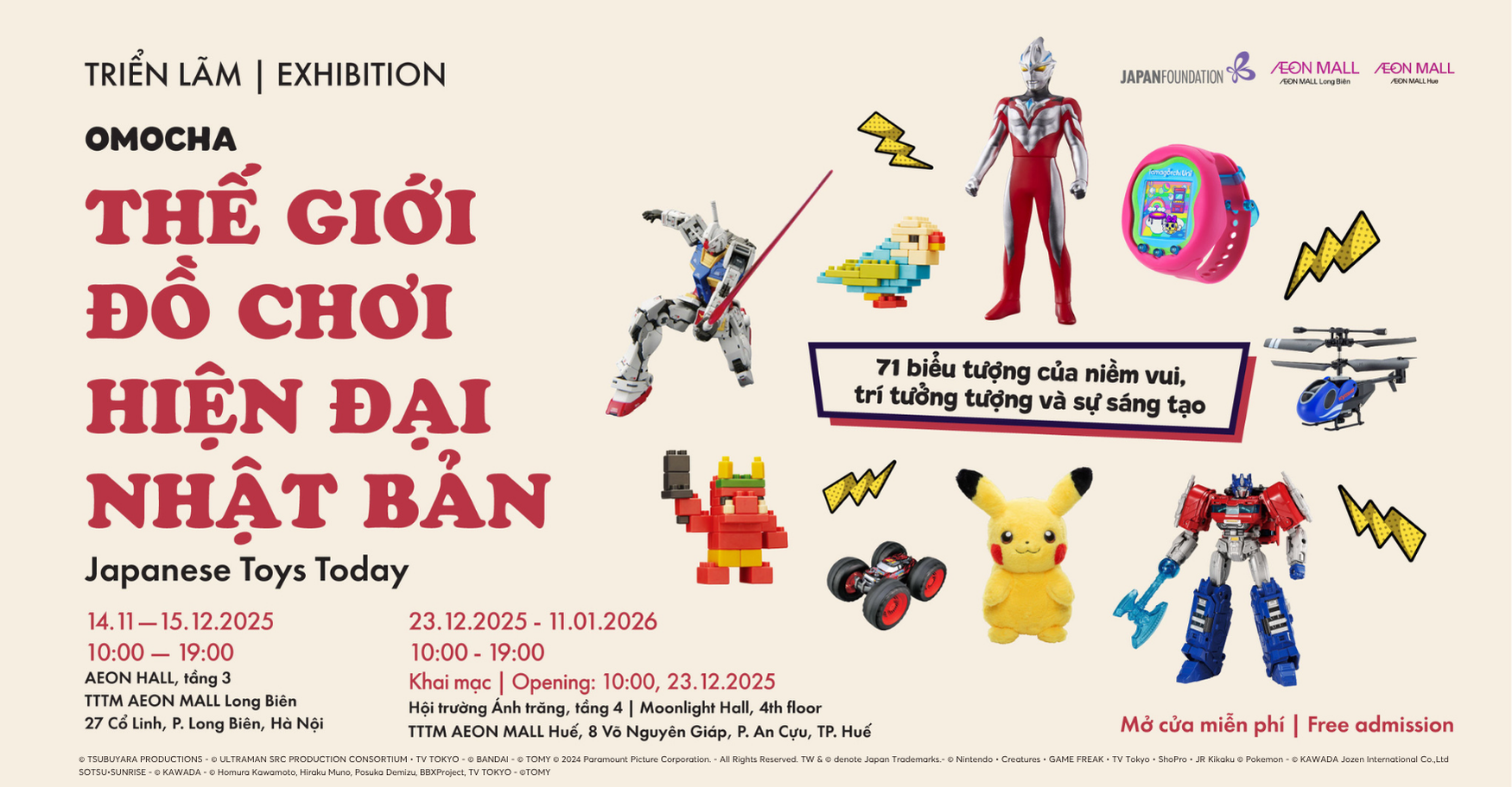 This November, the Japan Foundation invites audiences in Vietnam to rediscover the heart of Japanese play culture through OMOCHA: Japanese Toys Today, a traveling exhibition that celebrates 71 of Japan’s most iconic toys. OMOCHA – Japanese Toys Today is also a newly-formed travelling exhibition by the Japan Foundation, and Vietnam has been chosen to become the first country to showcase this wonderful world of modern toys. The exhibition will open at AEON Mall Long Bien, Hanoi on November 14, 2025, and will travel to AEON Mall Hue on December 23, 2025.