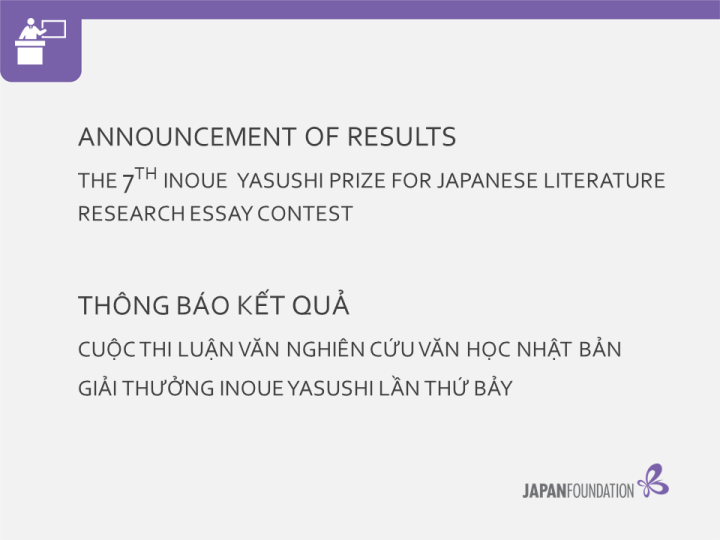 Trung tâm Giao lưu Văn hóa Nhật Bản tại Việt Nam (Quỹ Giao lưu Quốc tế Nhật Bản) và Quỹ Inoue Yasushi xin thông báo kết quả của cuộc thi luận văn nghiên cứu văn học Nhật Bản – Giải thưởng Inoue Yasushi lần thứ bảy như sau: