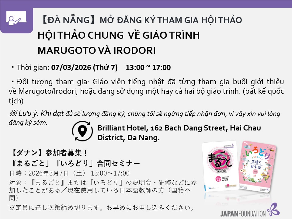 Hội thảo chung về hai bộ giáo trình hướng đến phát triển năng lực giao tiếp là Marugoto – Ngôn ngữ và Văn hóa Nhật Bản và Irodori – Tiếng Nhật trong đời sống (do Quỹ Giao lưu Quốc tế Nhật Bản biên soạn) sẽ được tổ chức vào thứ Bảy, ngày 7/3 tại thành phố Đà Nẵng.