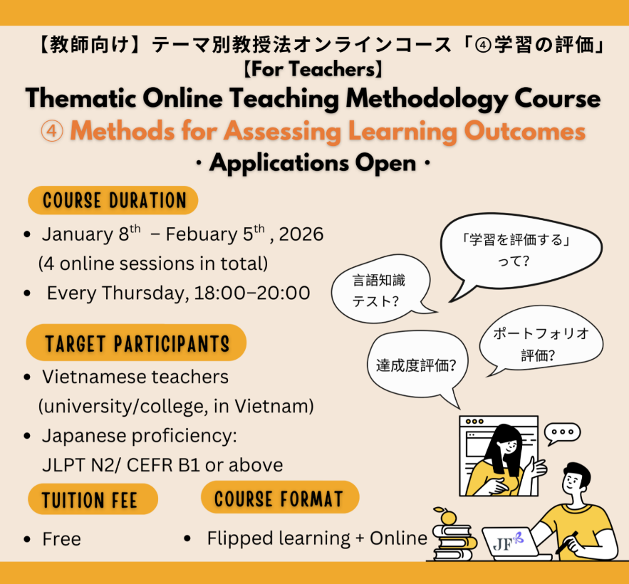 Through online study and group discussions, participants will explore the topic of “Assessing Learning Outcomes” — from creating tests to measure language proficiency to implementing portfolio-based assessments.