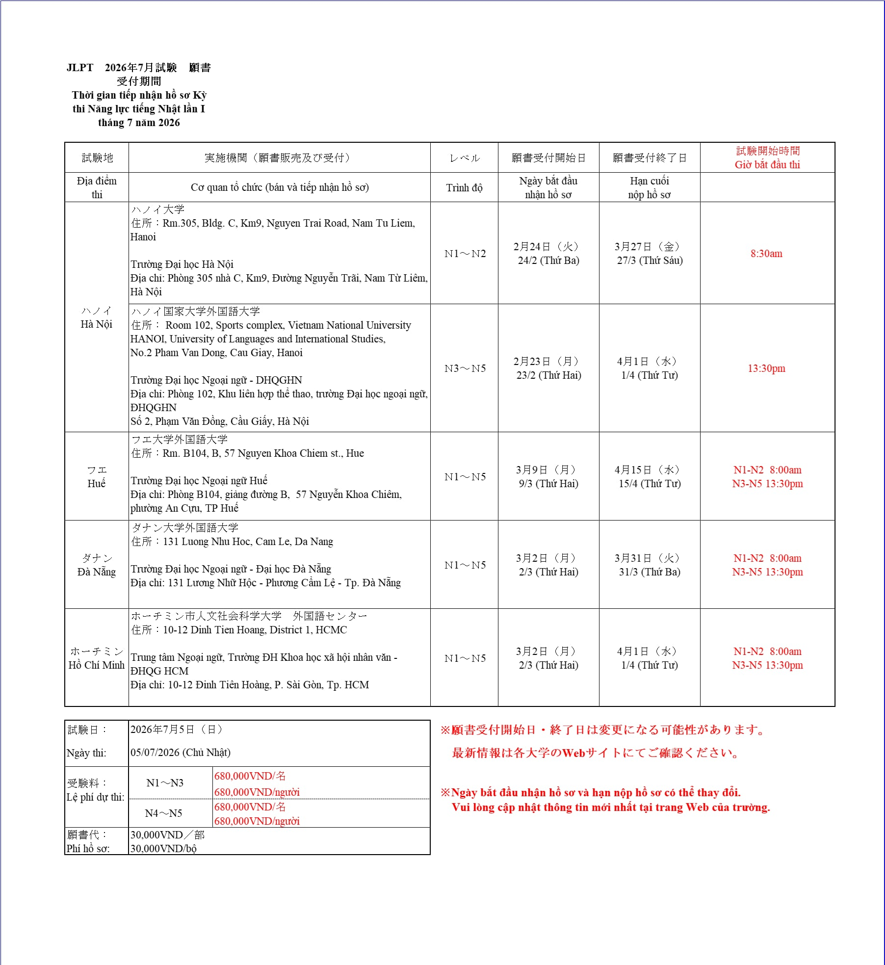 ♦ Sau đây, chúng tôi xin thông tin về Kỳ thi năng lực tiếng Nhật (JLPT) lần 1 tháng 7/2026 tại Việt Nam (tại thời điểm 3/3/2026). Ngày dự kiến bắt đầu nhận hồ sơ và hạn nộp hồ sơ tại đây có thể thay đổi tùy vào tình hình thực tế. Xin vui lòng theo dõi thông báo của các đơn vị tổ chức tại địa phương.
